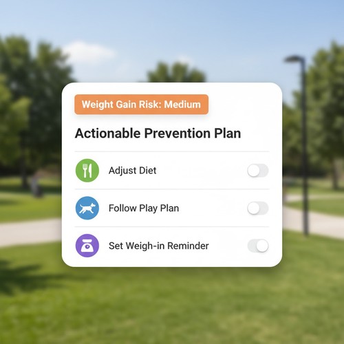 Predictive models estimate short-term and long-term risk for conditions like obesity, dental disease, arthritis, CKD (cats), or anxiety. Good systems translate “risk” into low-friction actions: