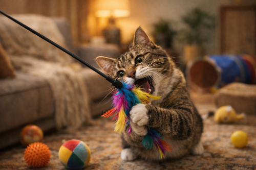 Indoor cats benefit from interactive toys, scratching posts, climbing trees, and daily play sessions. Mental stimulation prevents boredom and supports healthy behavior.