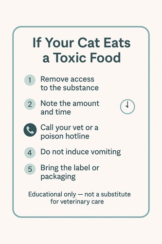 Also keep human medications, dog flea/tick products, and plant toxicants (e.g., lilies) far away—these aren’t “foods,” but are common ingestion hazards.