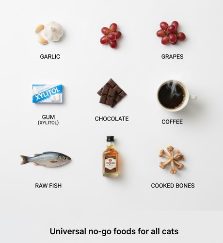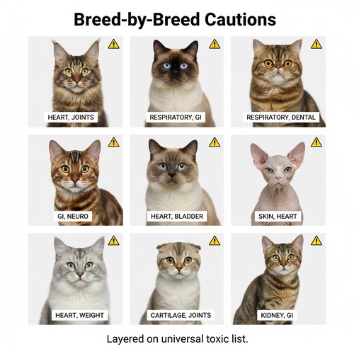 This guide outlines foods that are universally unsafe for all cats and adds breed-by-breed cautions based on common predispositions (e.g., obesity, urinary, cardiac, or digestive sensitivities). Educational only; not medical advice.