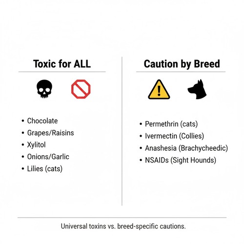 Where breeds differ is usually in predispositions—weight gain, urinary crystals, digestive sensitivity, cardiac or kidney risks. These don’t make a food “toxic,” but they shift risk and change what should be limited or avoided.
