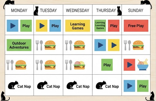 | Sun | Free-choice play | Grooming + mobility | Light day; extra snuggles |